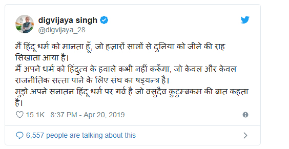 गौरतलब है कि इससे पहले दिग्विजय ने ट्वीट में कहा था कि मैं हिंदू धर्म को मानता हूँ, जो हज़ारों सालों से दुनिया को जीने की राह सिखाता आया है। मैं अपने धर्म को हिंदुत्व के हवाले कभी नहीं करूँगा, जो केवल और केवल राजनीतिक सत्ता पाने के लिए संघ का षड़यंत्र है।